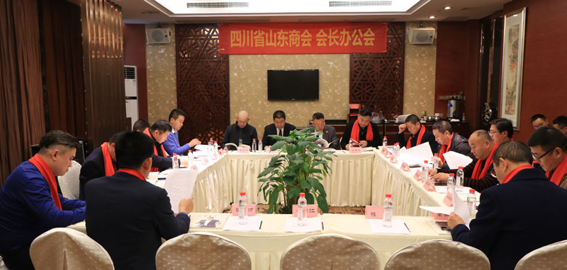 2019年1月9日下午3点四川省山东商会会长办公会在山东老家饭店淄博厅召开。商会会长韩东,监事 长支才章,常务副会长范会涛、张悦鹏、张玉成、马建伟、王明福,副会长汪涛、董振峰、孙肖璞、董建 滨、祖伟、李杰华、管彦江、魏宗惠、李蕾、王桂忠、李世友、朱国昌、徐鑫、张连泉、张秀才、周涛参加会议。会议由秘书长杨涛主持。